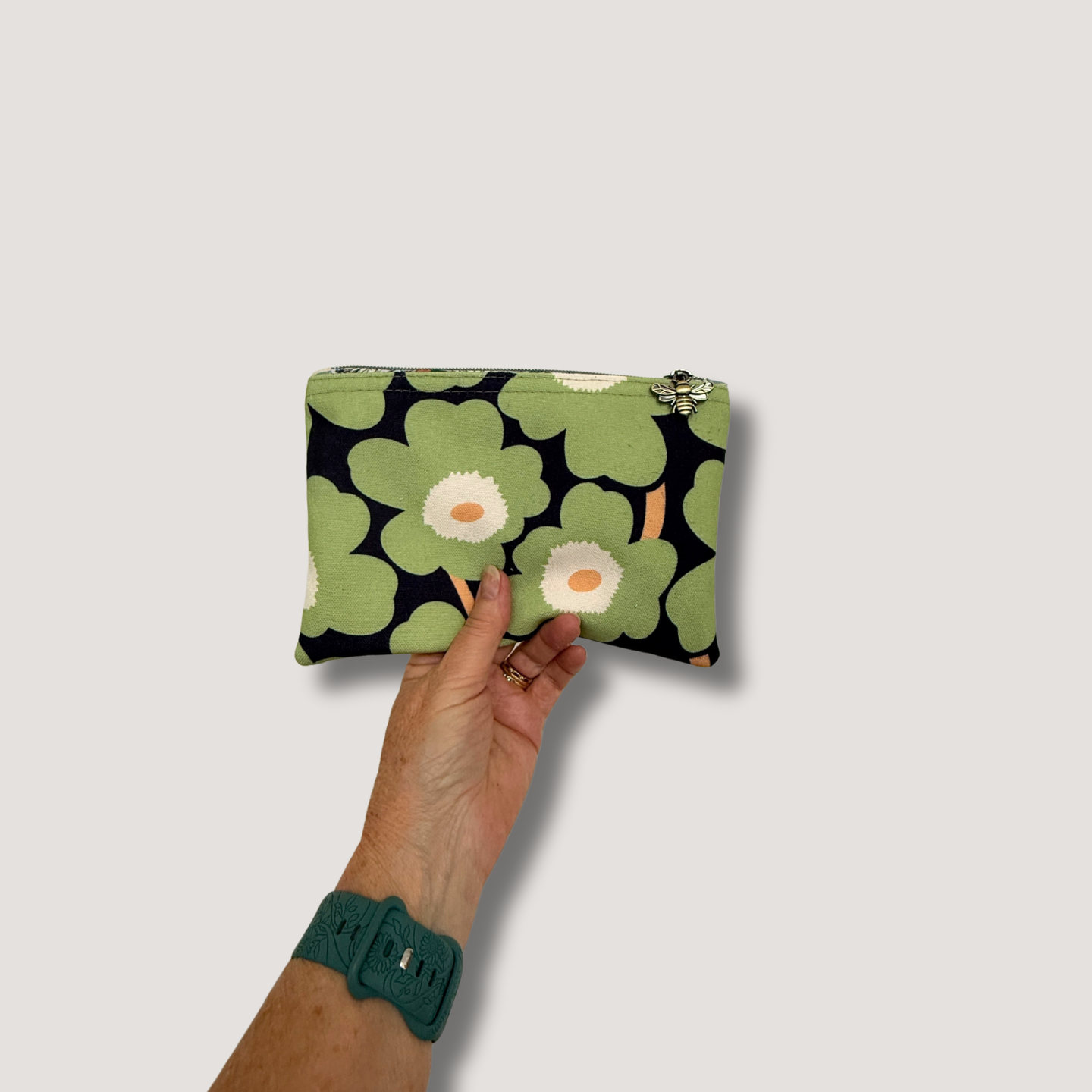 20 x 15cm with a gorgeous brushed bronze bee zipper pulley!