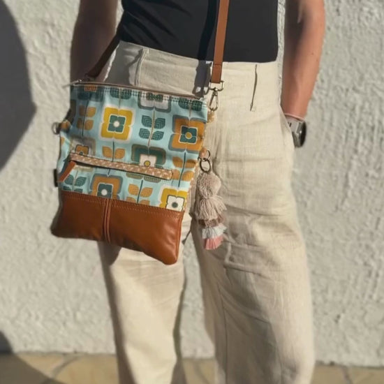 This fold-over bag is featuring a dual print. A Floral Retro print on one side and a Tan diamond print on the other so you can mix it up and have choice how you wear your bag. A cotton printed lining and a gorgeous stitched leather tassel. The fold over bag can be worn over the shoulder with style and you will love the easy way to carry your precious items. The top zipper opening gives you the full depth of the bag, while allowing the bag to be folded over for a smaller size. The straps can be changed to give the fold-over bag look or lifted to the top rings for a “long look” bag. The straps can also be removed for the bag to be the perfect clutch.