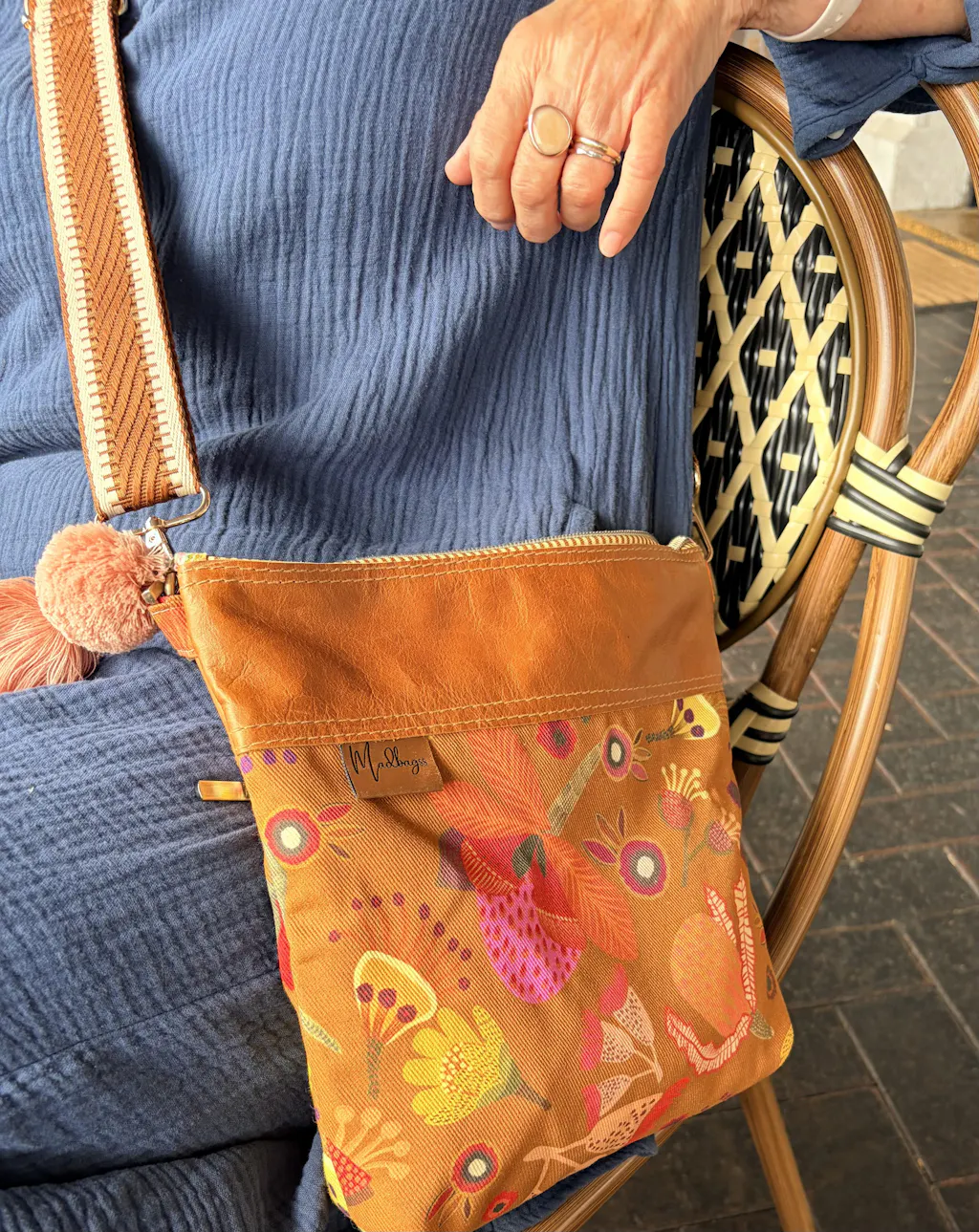 This style features gorgeous printed cotton canvas and lined in a beautiful printed cotton lining with the feature Italian leather topping the bag. It comes with a tassel and an adjustable leather cross body/shoulder strap.